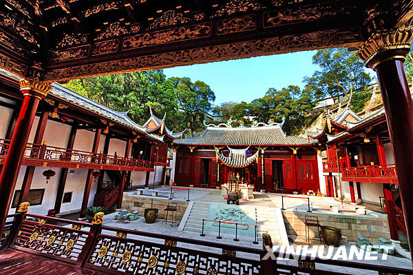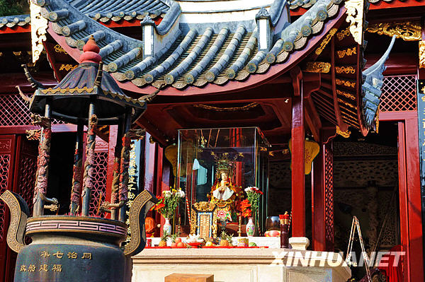 重建后的福州马尾船政天后宫(4月14日摄)。重建的船政天后宫将于4月18日对游人开放。重建后的船政天后宫占地面积7205平方米,建筑总面积1500平方米,门楼高12米,主殿5开间,进深8.3米,总布局为一轴二进二院,一进为门楼,二进为供奉妈祖的中堂大殿。船政天后宫位于福州马尾婴脰山,清同治七年(1868年)春动建。正殿供妈祖神像,殿上方有同治御赐“德施功溥”及“天上圣母”匾。1929年天后宫改为林孝女祠。抗日战争后,宫中文物散失严重,1971年天后宫被拆毁。(新华社记者 张国俊摄)