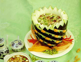 1.将光鸭洗净;冬瓜去皮切块;葱洗净。 2.炒锅内放油烧五成热,将光鸭放进炒锅内炸透捞出沥油。 3.将鸭、冬瓜、陈皮、姜块、葱条、米仁放入场锅中,加清水5杯,用大火烧开锅后,烹入米酒、精盐3荼匙,改用小火提至酥 烂,放入精盐2茶匙调味即成。 特点:此菜汤味鲜美,营养丰富。