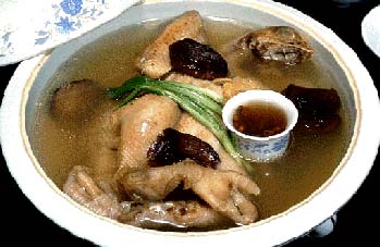 【原料】 肥嫩母鸡1只,水发香菇2朵,火腿肉2片,高粱酒50克,鸡汤750克,丁香子5粒。