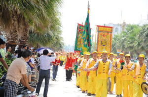 “踩街”队伍从东山关帝庙出发,沿着朝圣路、水仙宫、渔港中路、大沃路一路前行。“我今年53岁,从第一届踩街活动开始连续6年都来参加腰鼓表演,我们腰鼓队的成员基本上都是‘踩街’活动的元老。”来自铜陵镇的黄巧珍阿姨说。来自台湾省台南市的关帝信众林展木先生表示,“东山与台湾关帝文化信仰,是同根同源的神缘关系。这是海峡两岸地缘相连、亲缘相近、神缘相同、业缘相助、物缘相似的明证。”