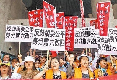 资料图:一群大陆配偶5月8日到台湾立法机构陈情,希望能将取得台湾身份证的年限从6年缩成4年。图片来源:台湾《苹果日报》