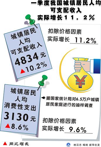 一季度我国城镇居民人均可支配收入实际增长11.2%