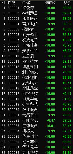比如以大家特别关注的一家公司,华谊兄弟作为例子,作为创业板首批上市公司,它在刚刚公布的三季报不仅没有业绩增长,反而出现了明显的下滑,三季度的整个收入下滑同比下滑了13%,而利润下滑了17%。像这样的公司如果它不跌停谁跌停呢?其基本情况还不如很多主板和中小板,当然这不是所有28家公司的情况。
