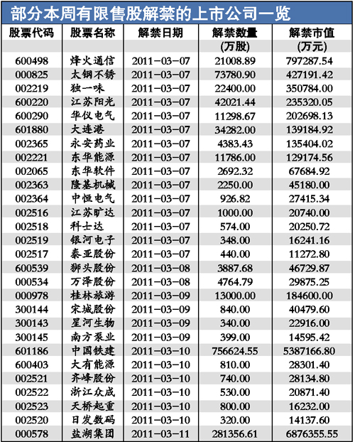 从个股的解禁市值来看,盐湖集团位居首位。数据显示,该公司的28.14亿股的限售股将于3月11日解禁。如果按照该公司停牌前的24.44元的价格计算,解禁市值达到688亿元。中国铁建紧随其后,该公司75.66亿股有限售条件的股票3月10日出笼,解禁市值达到539亿元,两者合计解禁市值达到1227亿元,占下周总解禁市值的80%。