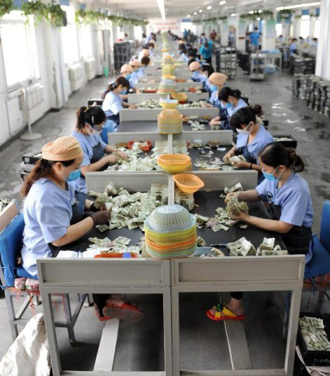 7月24日,在郑州公交总公司结算中心点钞部里,每天有120余名专职点钞人员对全市公交车的零钱进行清点工作。