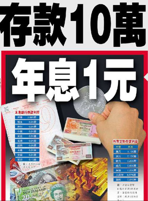 据香港大公报报道,外围资金持续流入,银行体系严重“水浸”,令港元拆息低无可低。汇丰银行率先下调港元活期存息,纾缓资金成本压力,由原来0.01厘,大幅削至0.001厘。换言之,10万港元存款年息由原来10元,减至仅收息1元。银行界人士指出,低存息将诱发资金由银行体系,流入至资产市场,寻求较高回报,但提醒市民应审慎入市。