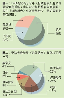 据香港《文汇报》报道,香港特首曾荫权下月会发表新年度施政报告,并已定调以推动香港中长期经济发展为主轴。最新民意调查显示,有49%受访香港市民对此表示“认同”,“不认同”者只占22%。最多受访者认为,新年度施政报告应重“民生福利”及“经济发展”。