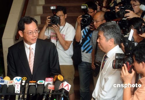 资料图:七月十七日,港府财政司司长曾俊华在政府总部向媒体宣布,委任陈德霖为金融管理局总裁后,陈德霖会见媒体表示,上任后首要任务是要继续维持货币及银行体系的稳定,联系汇率是香港最重要基石,将不会改变。 中新社发 邓庆乐 摄