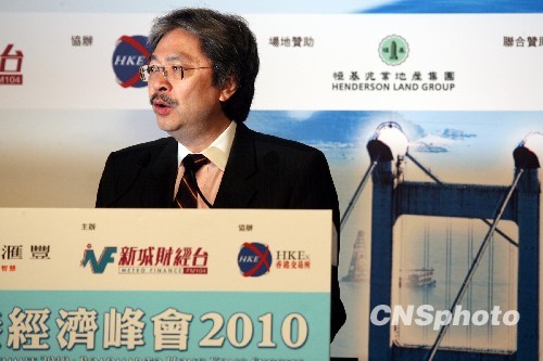 十二月十四日下午,“香港经济峰会二0一0” 假香港四季酒店举行,香港特区政府财政司司长曾俊华出席并在“峰会午餐会”发表重要演讲。 中新社发 郑祚声 摄