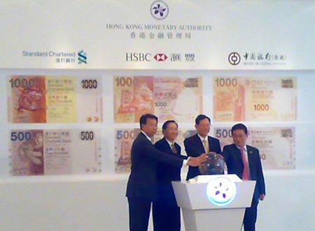 金管局总裁陈德霖发言时表示,为减低钞票被伪冒的风险,金管局与香港三间发钞银行于2007年中开始,经过3年的研发设计了一套全新的钞票系列,在筹备的过程中,他们采用了最尖端防伪设设及雕版印刷技术,大大加强新钞的防伪功能,及容易辨认的优点。