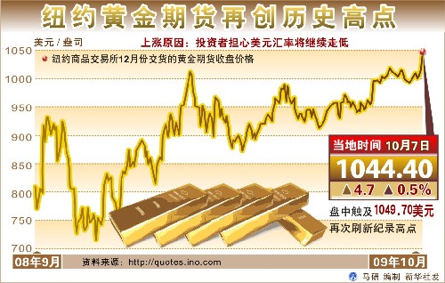 受美元汇率重新下跌影响,纽约商品交易所黄金期货8日连续第三个交易日创出历史新高。交投最活跃的12月合约终盘上涨11.90美元,收于每盎司1056.30美元,涨幅为1.2%。该合约盘中一度涨至1062.70美元的新的纪录高点。