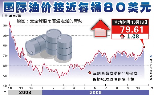 据上海证券报报道一波八连阳、累计升幅逾14%的上涨小高潮,将国际油价送上了又一个整数关口——80美元。伴随着全球股市的高歌猛进和美元的跌跌不休,20日电子盘中,纽约11月份原油期货轻松突破80美元,最高触及80.40美元,创下一年来盘中新高。