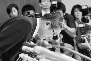 9月10日,日本振兴银行宣布进入破产保护程序,日本振兴银行社长小 晴喜在新闻发布会上鞠躬致歉。新华社图