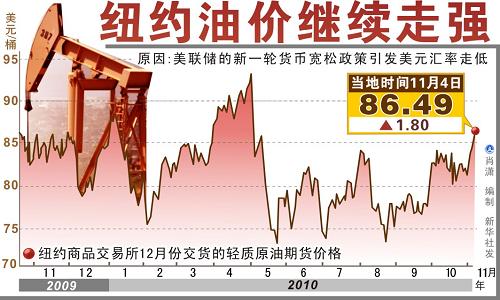 国际油价上周出现“五连阳”,纽约商业期货交易所(NYMEX)12月原油期货上周五收报86.85美元/桶,超过今年的最高收位86.84美元,且录得2008年10月8日以来的最高结算价。盘中最高达到87.22美元/桶,为2008年10月9日以来的最高水平。