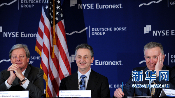 2月15日,在美国纽约证券交易所,纽约泛欧交易所董事长让-米希尔·赫塞尔斯、首席财务官迈克尔·杰泽勒、首席执行官尼邓肯·尼德奥尔(从左至右)出席新闻发布会。新华社记者申宏摄