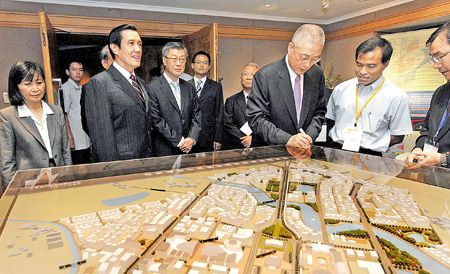 马英九、吴敦义(右3)及刘忆如(左1)参观航空城等招商案。来源:台湾《旺报》