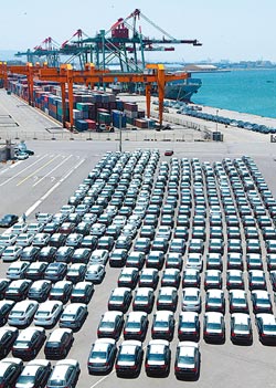 赶在奢侈税6月1日开征前,巴拿马籍乌托邦公爵号汽车船,29日载着总数共一千辆的BMW、BENZ汽车抵达台中港,码头上停满百万以上亮闪闪的进口车海。 图片来源:台湾《中国时报》