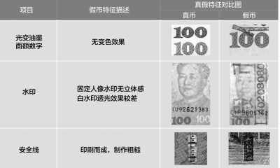 央行提示公众,可通过三种方法识别假币:一是“迎光透视”,真币的水印立体感很强,而假币的水印无立体感,制作粗糙;二是“倾斜看”,真币的光变油墨面额数字垂直角度观察为绿色,倾斜一定角度观察为蓝色,而假币没有变色效果;三是“轻轻触摸”,在光线较暗的情况下,可以用手指轻轻触摸钞票正面右侧的凹印手感线、上方“中国人民银行”字迹、中间团花、毛泽东头像等部位,真币有如浮雕一般的凸凹手感,而假币或平滑或经过造假者二次加工出现比较突兀、不均匀的凸凹感。