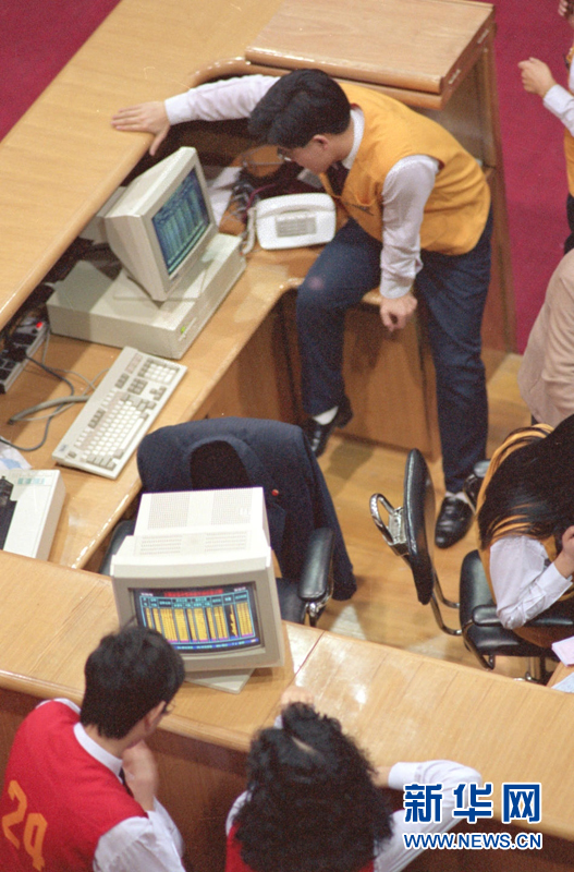 1990年12月中旬,位于上海黄浦路15号浦江饭店(原理查饭店)内的上海证券交易所正式开业。图为身穿红背心的中介经纪人全神贯注地盯着行情动态显示牌,准备寻找最佳时机进行交易。新华社记者 柳中央 摄(资料照片)