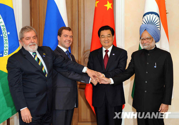 6月16日,中国、巴西、俄罗斯和印度“金砖四国”领导人在俄罗斯叶卡捷琳堡举行首次正式会晤,中国国家主席胡锦涛出席会晤。这是胡锦涛主席和巴西总统卢拉、俄罗斯总统梅德韦杰夫、印度总理辛格合影。新华社记者姚大伟摄