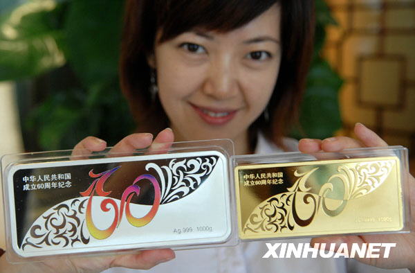 7月14日,工作人员展示新中国成立60周年纪念金银条凤舞系列。由中国印钞造币总公司制造发行、中钞国鼎公司总经销的中华人民共和国成立60周年纪念金银条,将于7月23日在北京菜百商场首发。该套产品分为龙腾系列和凤舞系列。新华社发