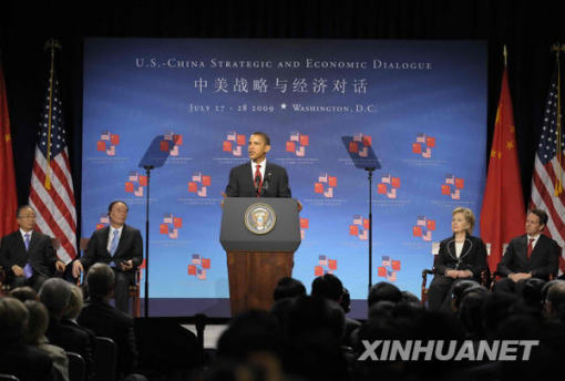 7月27日,首轮中美战略与经济对话在美国华盛顿开幕。中国国家主席胡锦涛特别代表、国务院副总理王岐山,国务委员戴秉国出席开幕式。这是美国总统奥巴马在致辞。新华社记者张岩摄