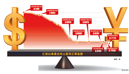 最近,人民币兑美元汇率再次出现单向升值的走势,昨日,人民币兑美元中间价再次跳升62个基点,报6.7110,至此,人民币汇率已连续7日创下汇改以来新高。自9月初以来,人民币兑美元中间价已由6.8126元对1美元上升为6.7110元兑1美元,升值幅度已超过1.5%。
