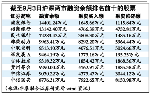 数据显示,截至2010年9月3日,沪深两市融资余额排名前三名的股票分别是浦发银行、招商银行、民生银行,其次依次是潍柴动力、中联重科、深发展A、吉林敖东、贵州茅台、中信证券、中信国安。从这些股票所分布的行业来看,金融服务、交运设备、机械设备、采掘、食品饮料和化工是主流。