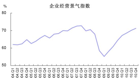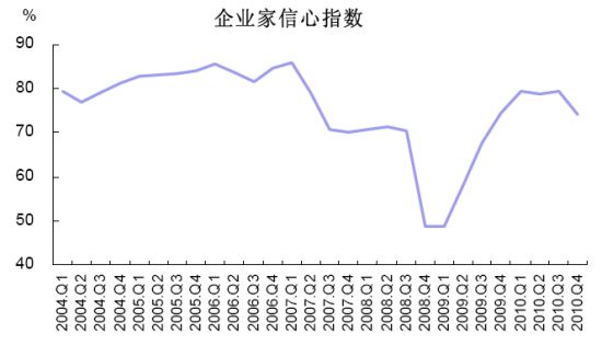 2010年第4季度,中国人民银行在全国进行了企业家问卷调查,调查结果显示:企业家信心高位回落;企业经营状况良好,景气指数连续第七个季度攀升,未来预期谨慎乐观;国内订单继续上行,出口订单出现下滑;原材料价格上升明显;支付能力创新高;企业投资意愿转升为降,出现波动。