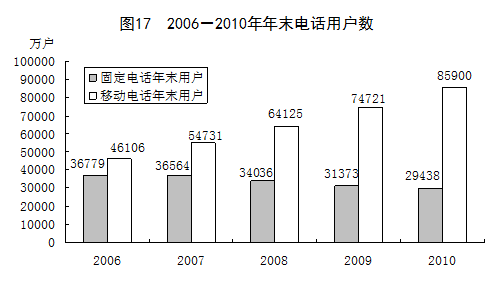 全年完成邮电业务总量[9]32940亿元,比上年增长20.6%。其中,邮政业务总量1985亿元,增长21.6%;电信业务总量30955亿元,增长20.5%。全年局用交换机容量减少2707万门,总容量46559万门;新增移动电话交换机容量[10]6433万户,达到150518万户。固定电话年末用户29438万户。其中,城市电话用户19662万户,农村电话用户9776万户。新增移动电话用户11179万户,年末达到85900万户。其中,3G移动电话用户[11]4705万户。年末全国固定及移动电话用户总数达到115339万户,比上年末增加9244万户。电话普及率达到86.5部/百人。互联网上网人数4.57亿人,其中宽带上网人数4.50亿人;互联网普及率达到34.3%。