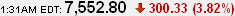 台股收盘重跌300点 加权股价指数为7552.8点