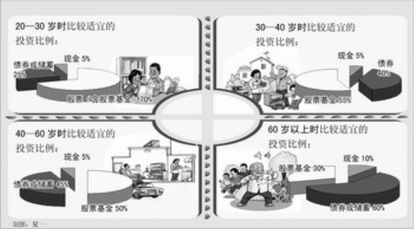 摩根士丹利华鑫基金公司副总经理秦红表示,一般随着年龄增长,投资者的风险承受能力会逐步降低,因此需调整激进型理财工具(如:股票基金)和稳健型理财工具(如:债券基金、超短债基金、货币市场基金)的投资比例。