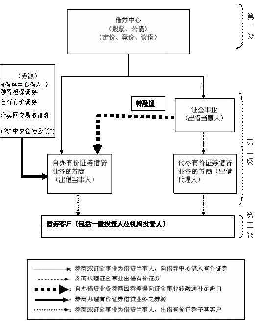 随着证券市场与证券衍生商品市场发展,台湾信用交易制度及后来推出的以交割为需求的借券制度,已经无法满足法人机构的中性借券需求。为顺应需求,配合证券及其衍生性市场发展,台湾证交所于1996年9月实施“台湾证交所有价证券借贷办法”,正式推出有价证券借贷制度,以证交所为中介人开办集中式有价证券借贷业务,特定机构法人为参加人,出借人与借券人可以通过券商向证交所申请以定价、竞价或议借交易方式借入有价证券,出借人可赚取出借收益,借券人则可满足其套利、避险交易及履约等策略性操作的需求。营业时间是星期一至星期五每日上午9时至下午2时30分,还券作业则至下午3时,与集中交易市场营业时间相同。证券柜台买卖中心也于2000年9月推出交割所需的证券借贷制度。2003年6月30日台湾又推出“策略性交易借券制度”。2006年1月11日台湾当局公布“证券交易法”第60条修正条文,开放券商经主管机关核准后可从事有价证券借贷的代理。台湾“金融监督管理委员会”2006年8月11日发布“券商办理有价证券借贷管理办法”,确立证交所借券系统、券商营业处所经营有价证券借贷业务可以并存,由券商以当事人身分出借有价证券给客户,并使有价证券借贷业务与信用交易券源得以互通,放宽了信用交易“以资养券”的规定,即融资担保证券可供融券及出借券源,而借入证券则可充为融券券源,以增进有价证券的运用效率,同时尽可能维持有价证券借贷交易与信用交易的现行法律架构不变,以减轻对市场的冲击。至此,券商办理证券借贷业务的关系架构分三级:第一级为证交所及柜买中心及公债借券中心,第二级为自办有价证券借贷业务的券商及对券商办理借券转融通的证金公司,第三级为借券客户。
