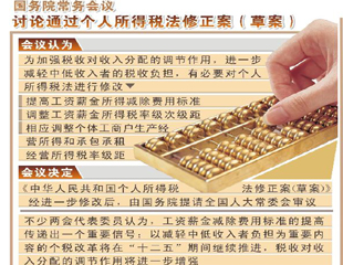 国务院总理温家宝1日主持召开国务院常务会议,讨论并原则通过《中华人民共和国个人所得税法修正案(草案)》和《成渝经济区区域规划》。会议认为,为加强税收对收入分配的调节作用,进一步减轻中低收入者的税收负担,有必要对个人所得税法进行修改,提高工资薪金所得减除费用标准,调整工资薪金所得税率级次级距,并...