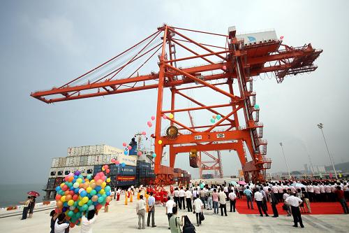 6月16日拍摄的台州港大麦屿港区对台湾基隆港集装箱运输首航仪式。当日,浙江省台州港大麦屿港区对台湾基隆港集装箱运输首航仪式在台州港5万吨级多用途码头举行。大麦屿港区是今年5月16日国家交通运输部新增的5个两岸海运直航港口(港区)之一。新华社发(王天荣 摄)