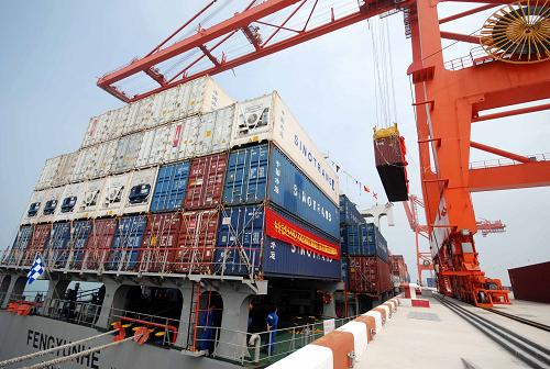 6月16日,在台州港大麦屿港区,集装箱被缓缓吊上集装箱货轮。新华社发(郏策 摄)
