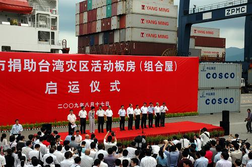 8月17日,深圳捐助台湾灾区物资启运仪式在深圳盐田港举行。当日,深圳捐助给台湾灾区的首批100套活动板房从深圳盐田港启运。台风“莫拉克”使台湾遭受50年来最严重的水灾,为帮助受灾的台湾中南部地区,深圳市委、市政府日前决定向台湾灾区捐赠1000套活动板房,总价值近2000万元。新华社记者 吴俊 摄