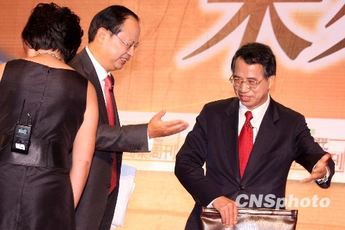 8月24日晚,中国移动董事长王建宙(左)在台北发表演讲后,与台湾中华电信董事长吕学锦等人同台,畅谈移动世界的未来影响力。中新社发 董会峰 摄
