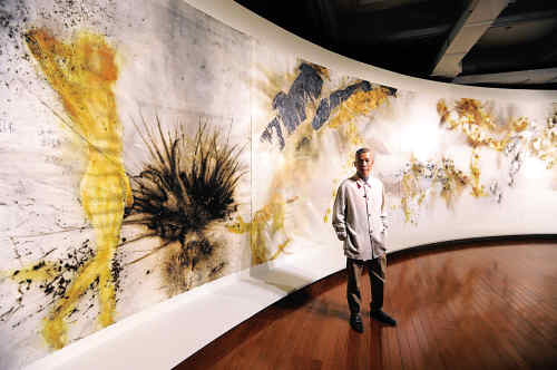 蔡国强和他的爆破草图作品《昼夜》。 新华社发