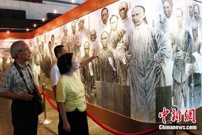 图为台湾抗日爱国诗人、教育家丘逢甲的3位遗族在先辈画像前参观。中新社发 黄少华 摄