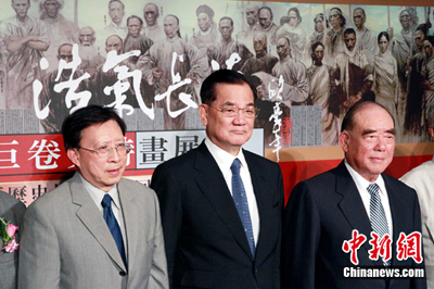 7日,由大陆民间绘制、长逾800米的“浩气长流·抗战巨卷史诗画展”在台北开幕,以纪念中国抗日战争全面爆发73周年。中国国民党荣誉主席连战(中)、台湾文化总会会长刘兆玄(左)、曾参与抗战的前台湾军方参谋总长郝伯村(右)出席致辞时都提到,那场为了国家民族尊严与生存而艰苦奋斗的抗战历史不应忘记。两岸当共同弘扬中华文化,促进和平发展。中新社发 黄少华 摄
