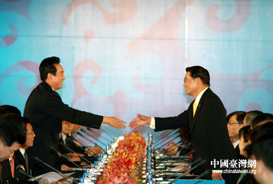 中国台湾网12月21日台北消息 两岸两会领导人第六次会谈21日上午9时在台北圆山饭店举行,海协会会长陈云林与海基会董事长江丙坤在台北再度握手。(特派记者 钟宝华)