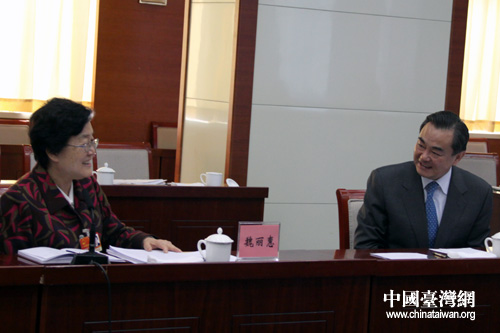 王毅在小组讨论会上听取台籍人大代表魏丽惠的意见、建议。(中国台湾网 王伟 摄)