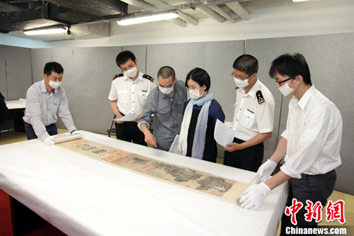5月18日,北京海关快速验放赴台北故宫博物院《山水合璧—黄公望与富春山居图特展》参展的12件珍贵文物。 中新社发 雷虹 摄