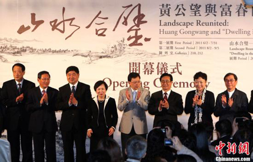 “山水合璧—黄公望与富春山居图特展”6月1日上午在台北故宫举行开幕仪式。浙江省委书记赵洪祝、国家文物局局长单霁翔、台湾中华文化总会会长刘兆玄、台北故宫博物院院长周功鑫等出席。中新社发 赵振清 摄
