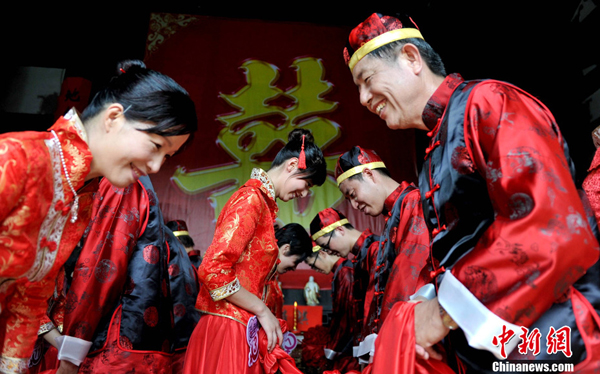 8月3日,来自海峡两岸的16对新人在福建泰宁尚书第古厝里举行客家民俗婚礼。当日,由台湾南投与福建泰宁携手“情定泰宁·合欢南投”两岸新人秀活动正式启动,两地县长共同见证了16对新人的传统客家婚礼仪式。中新社发 王东明 摄