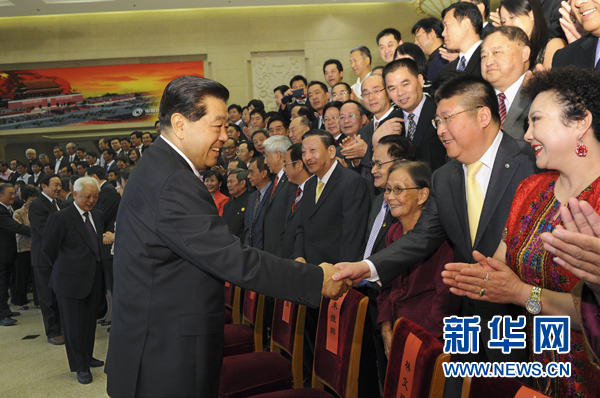 6月19日,中共中央政治局常委、全国政协主席、中国和平统一促进会会长贾庆林在北京会见出席中国和平统一促进会八届二次理事大会的全体代表。新华社记者 饶爱民 摄