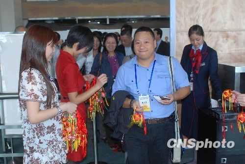 十月十九日,澳门-南宁航线开通,参加中国-东盟博览会的澳门企业家代表团成为首批乘客之一。该航线由澳门航空公司经营,这是澳航继桂林航点后开通的第二条澳门至广西航线。 中新社发 毕永光 摄