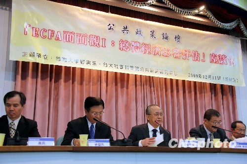 近来台湾内部密集讨论两岸经济合作框架协议(ECFA)议题,从产业界、经济主管部门到学界都各自发表独立见解,阐述若签署ECFA的利弊得失。图为于台湾大学召开的“ECFA面面观:总体经济影响评估”座谈会,台湾大学经济系教授胡胜正(左三)、“经济部次长”林圣忠(左二)、“陆委会副主委”高长(左一)、台湾大学教授林向恺(左四)等就相关议题作报告。 中新社发 曾嘉 摄