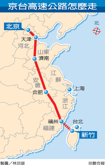 台湾媒体制作得京台高铁规划图。 图片来源:台湾《联合报》